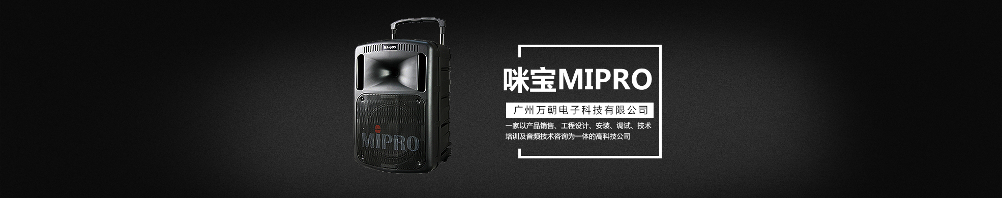 廣州萬朝電子科技有限公司成立于2008年,公司主要是一家以產品銷售、工程設計、安裝、調試、技術培訓及音頻技術咨詢為一體的高科技公司。主要代理銷售產品包括:咪寶MIPRO,舒爾SHURE,森海塞爾SENNHEISER,BOSE專業音箱,JBL系列音箱,皇冠CROWN功放,QSC功放,聲藝SOUNDCRAFT調音臺,雅馬哈YAMAHA,DBX及AKG等周邊器材。